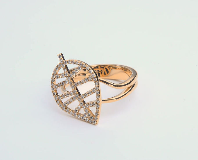 Een De Parme Design signature Leaf, prachtig vormgegeven in een 18-karaats roségouden ring, pavé bezet met diamanten. Deze ring is tijdloos, perfect voor alle leeftijden – van jong tot oud – en veelzijdig genoeg om dagelijks of bij speciale gelegenheden te dragen. Een absolute klassieker, die elegantie en door de natuur geïnspireerde schoonheid combineert in één prachtig sieraad.